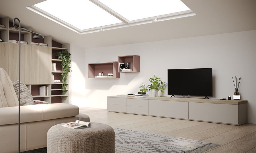 La parete scura fa risaltare la libreria in quercia, che rende l'ambiente più profondo e sottolinea le linee della stanza.