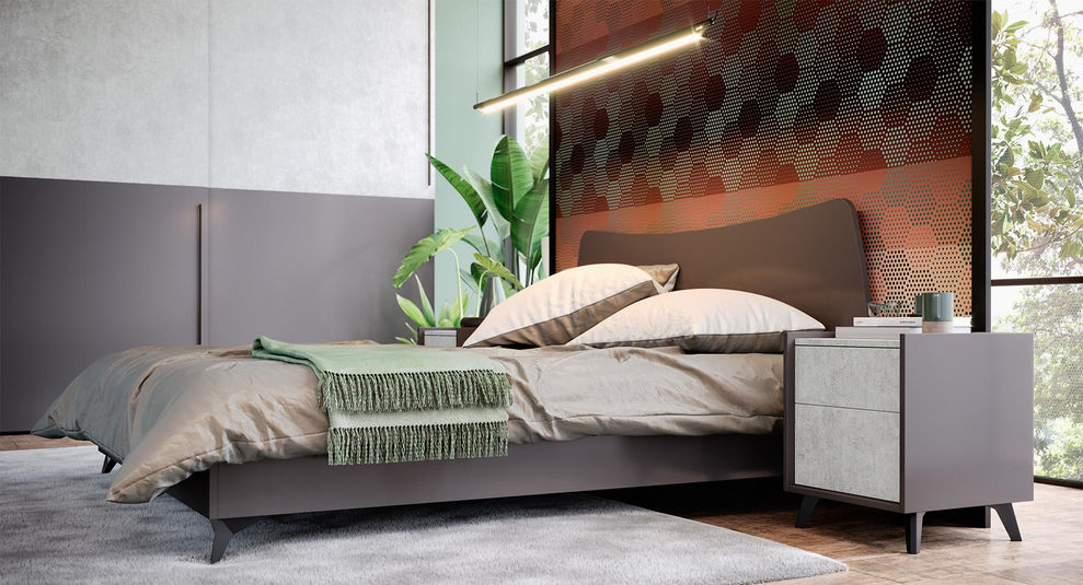 Armadio scorrevole a settori orizzontali in Grafite e Cemento con maniglia Stick e terminale Smart in Grafite e Cemento. Comodini e settimini Sly in Grafite e Cemento con piedi Bold. Letto Shape in Grafite con piedi Tris.