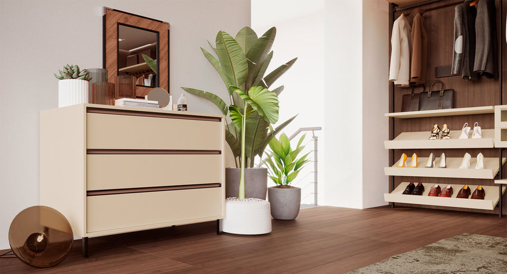 Parete attrezzata Stilos con ripiani, tubi appendiabiti, portascarpe e cassettiere con frontali telaio legno/vetro push-pull in Pelle. Comodini e comò Band in Pelle e Creta, con piedi Slim. Letto Dan in tessuto Bright con piedi Ring.